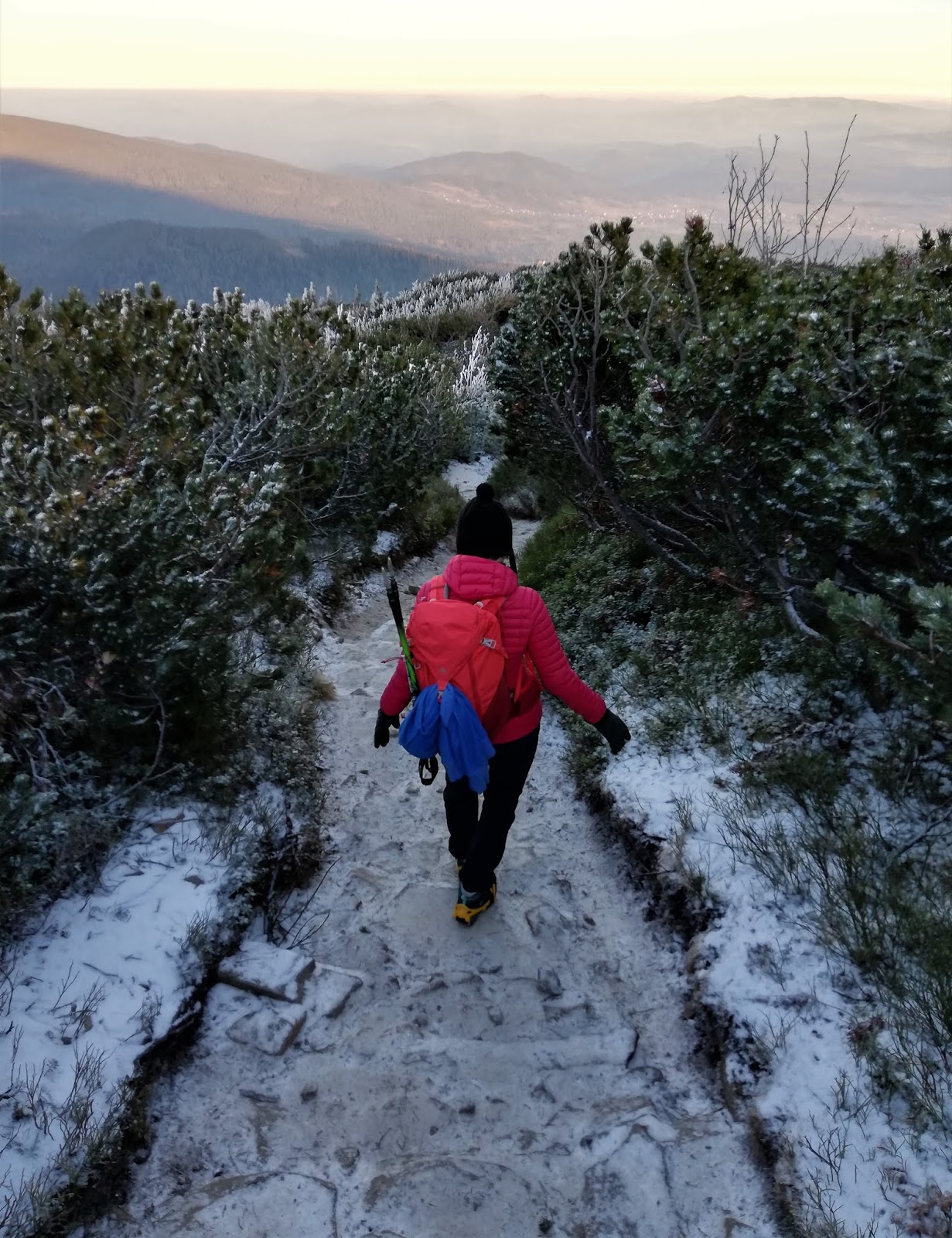 Zaskakujący śnieg sprawił, że cała wspinaczka przerosła moje oczekiwania pod względem intensywności przeżyć i radości dziecka, która się we mnie obudziła.... w pewnym szczególnym momencie. Byłam tak zaaferowana już na starcie, że przekroczyłam próg Parku Narodowego bez zakupionego biletu. Pan, donośnym okrzykiem, ściągnął mnie ... na ziemię. Zreflektowałam się na tyle, że zdążyłam przyodziać dodatkowe ciuchy, bo było naprawdę mroźno. I tak ubrana, udałam się pod strome już na początku podejście. Zadyszka jak zwykle. Tempo jak zwykle. Ale ślisko...... jak nigdy. Podpierałam się na kijkach, ale to niestety nie wpływało na wzrost tempa.